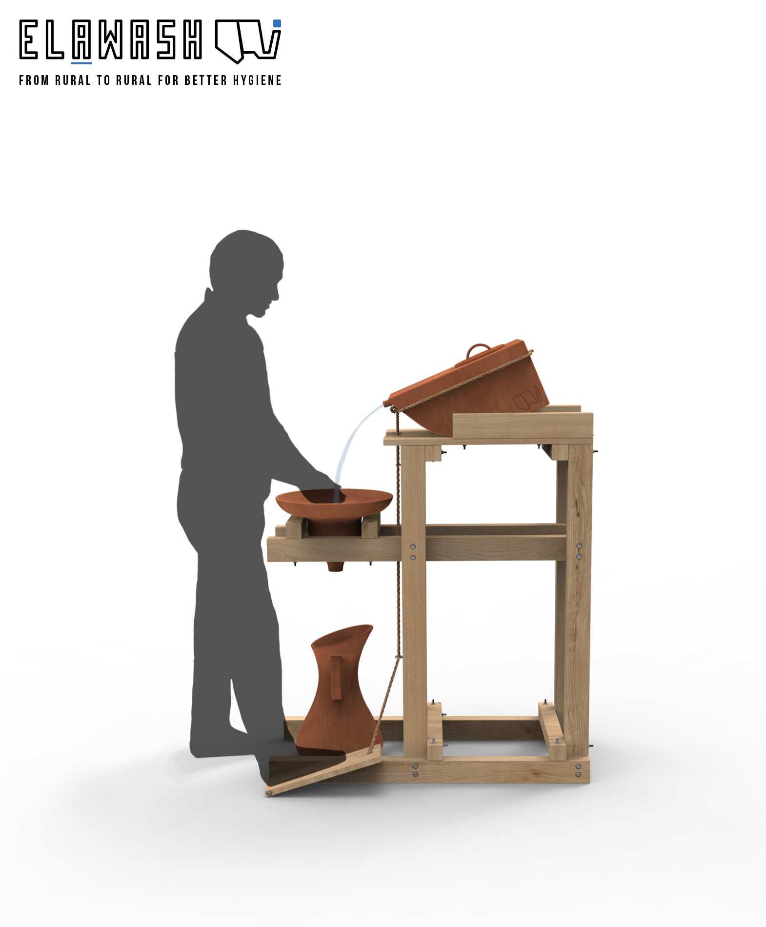 Third prize: "ELAWASH (Handwashing in Rural Ethiopia)" by Rafal Zajkowski (UK). Handwashing station designed for rural Ethiopia, using local materials (wood, bamboo and steel) and mechanically operated to promote daily hygiene.