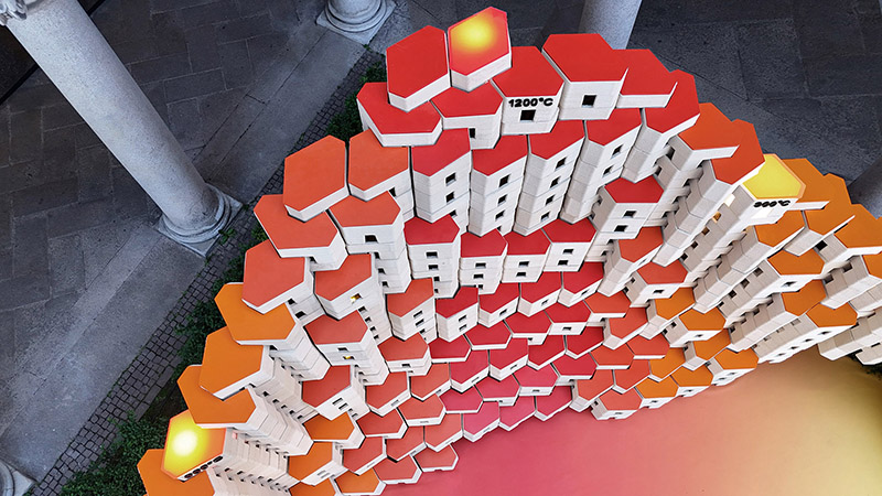 Each block that makes up the project is produced with a low-environmental impact process, using a combination of virgin clay and recycled ceramics from the production of bathroom components. Measuring 50x40x25cm, the design allows for a self-supporting and dry-assembled structure. This not only enhances its aesthetic appeal, but also allows for easy disassembly and paves the way for potential re-use of the blocks in future events.