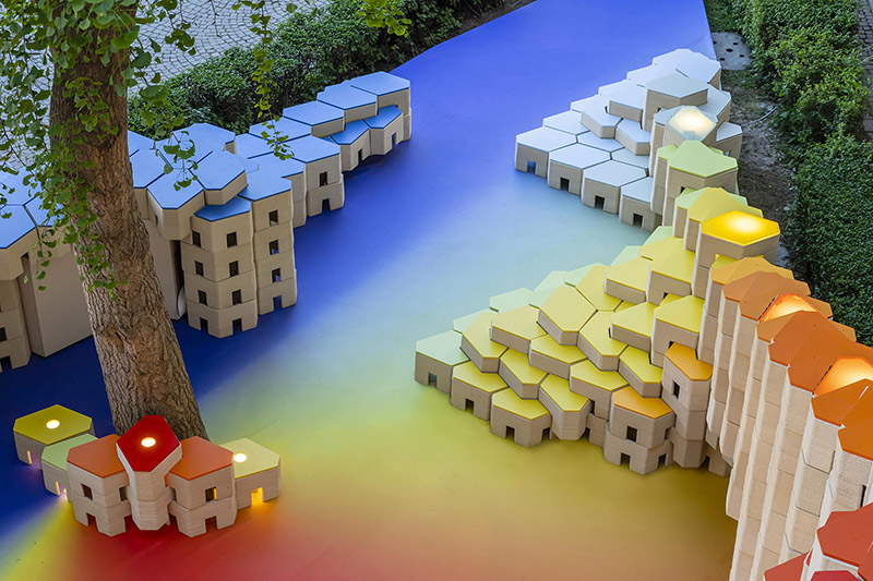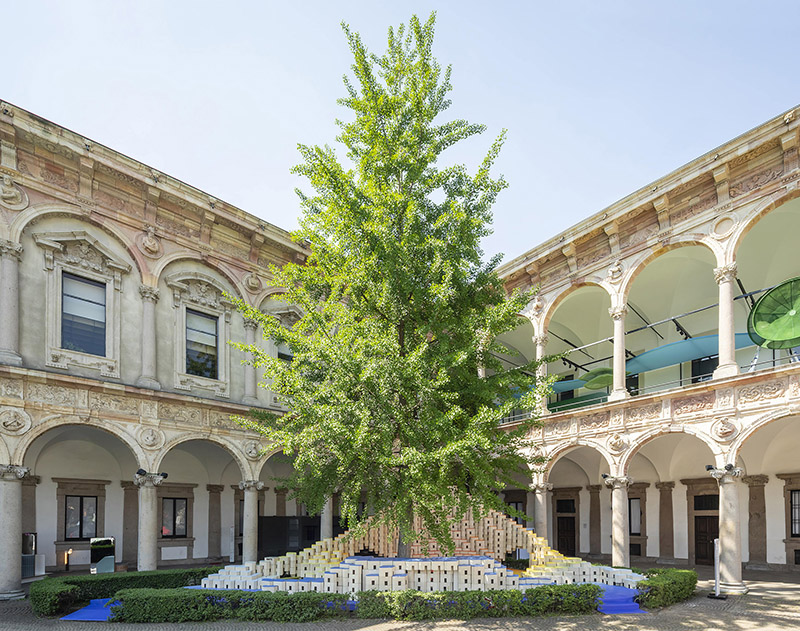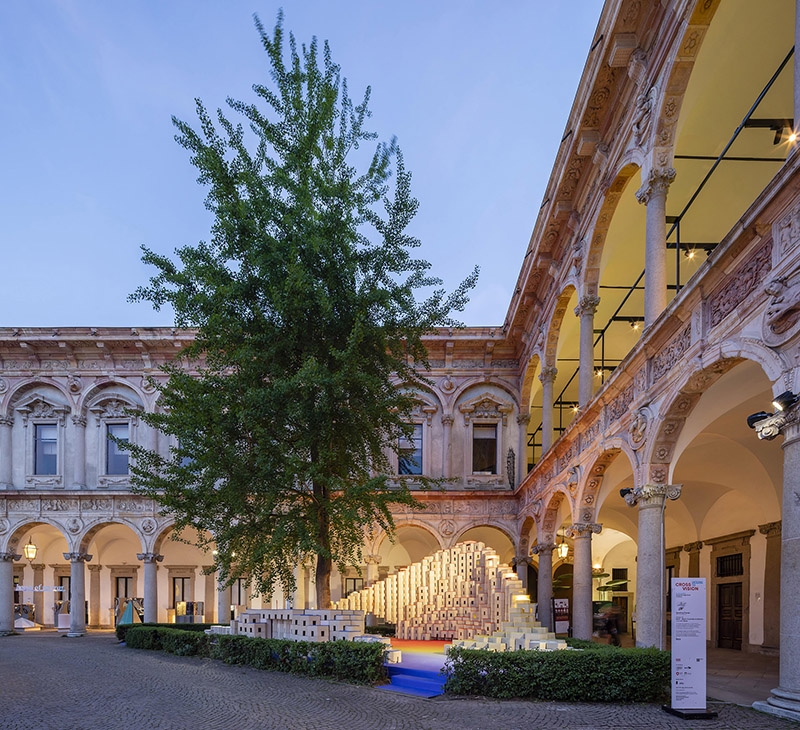 The installation's elegantly curved design with varying heights fits perfectly into the triangle-shaped plot and blends effortlessly into the courtyard of the University of Milan, offering a range of spatial and functional possibilities. More than just visually appealing, these versatile blocks become part of the narrative, transforming into inviting seating areas that encourage visitors to unwind, engage in conversation, and socialise in this dynamic space.